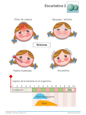 El escarlatina es una enfermedad infectocontagiosa caracterizada por fiebre alta de inicio súbito, dolor de garganta, cefalea, erupción cutánea, dolor abdominal, y en ocasiones, vómitos.